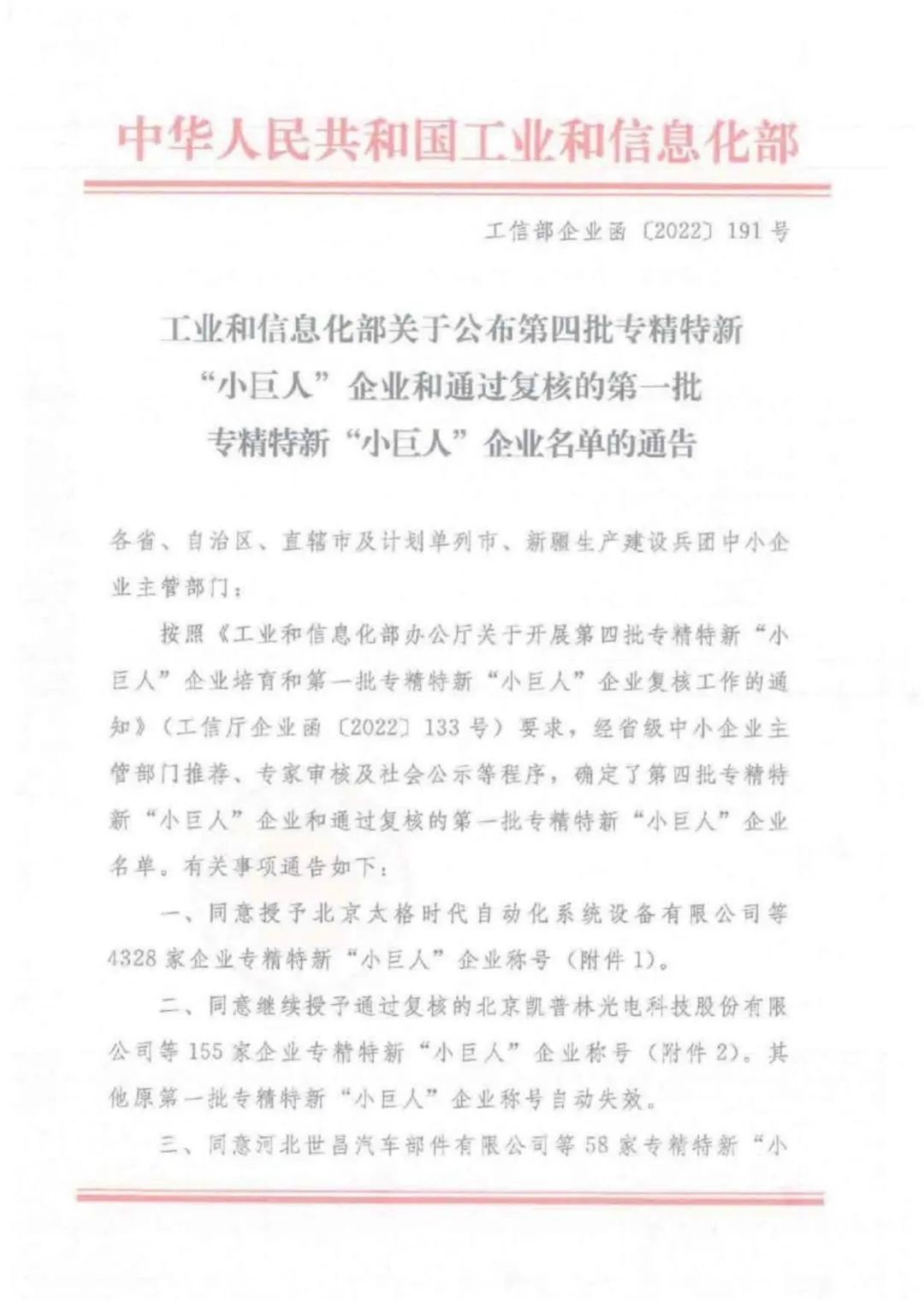 近日,中華人民共和國工業(yè)和信息化部下發(fā)了《工業(yè)和信息化部關于公布第四批專精特新“小巨人”企業(yè)和通過復核的第一批專精特新“小巨人”企業(yè)名單的通告》(工信部企業(yè)函[2022]191 號),公司成功通過工信部第四批專精特新“小巨人”企業(yè)認定。